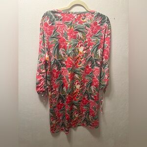 caribbean joe, tropical dress, hibiscus dress, floral cover up, resort wear, vacation dress, cruise outfit, beach coverup, tropicalcore, palm print, ruched sleeves, drawstring sleeves, stretch dress, tunic dress, pool day outfit, summer mini dress, island vibe, y2k beach, coachella vacation, size large dress