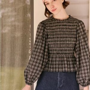 As flattering as it is comfortable, The Contessa Top. has an elasticized smocked bodice fitted through the waist, with a relaxed loose peplum hem. Blouson puff sleeves give it a feminine silhouette, and picot hemming supplies a dainty edge. It’s cut from a cotton dobby checked fabric with a beautiful textural quality.