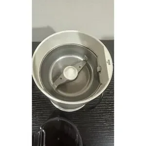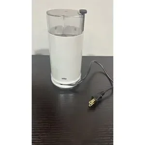 The Braun Aromatic Coffee Grinder Gourmet Edition KSM-4 is a sleek and efficient electric grinder designed for coffee enthusiasts. With a capacity of 2.5 oz, it is perfect for grinding beans for a fresh cup of coffee. The grinder features a blade grinding method, making it easy to achieve the perfect consistency for your coffee. The white plastic construction with a shiny finish adds a touch of elegance to any kitchen. Complete with a user manual and cord storage, this grinder is both functional and stylish, perfect for coffee lovers looking to upgrade their home coffee experience.
