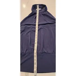 Flattering, polished, and just the right amount of flirty, the Halter Banded-Bottom Mock-Neck Knit Top is made to elevate your day-to-night looks. With a sleek mock neck, wide halter straps, and an open back with button closure, this easy-fit style finishes with a banded hem for a soft blousy silhouette. Navy blue. Excellent like new condition.