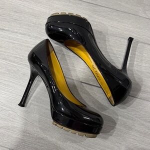 Glossy black finish. Striking platform design. Perfect for a chic look.