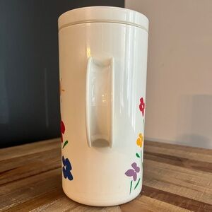 Adorable Teleflora Gifts pitcher made in 1985. This little pitcher is cream colored with purple, orange, red & blue flowers with a bold yellow sun. In great vintage condition.