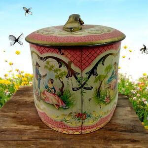 VTG 1920s English Nouveau Rococco Tea Tin Pink Gold Courting Couples Rococo