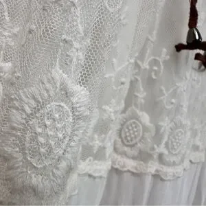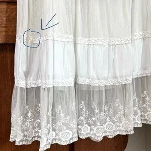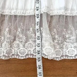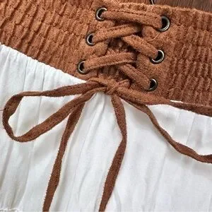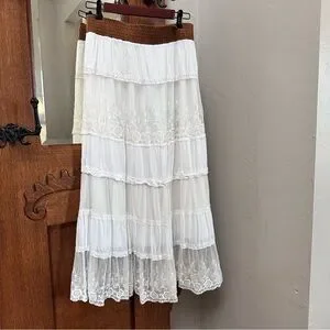 Beautiful white lace maxi skirt by Lapis. Features a waistband of brown suede like material with tie. Off white color, tired lace ruffles, lined. Beautiful, romantic; prairie skirt.