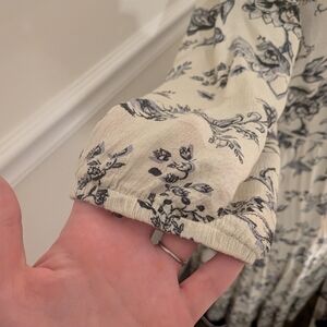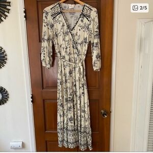 Chic long sleeve dress with a black floral pattern. Features a stylish wrap design. Ideal for casual outings. Like new, soft and lightweight, stretchy waist and sleeves. Waist belt included. V neck unbuttons making it a great nursing dress. Size medium but fits up to a large. Loose but compliments a range of body sizes.