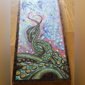 Handmade octopus tentacle wall art created on a solid wood panel using a combination of pyrography (wood burning) and hand-applied paint. The piece features detailed burned linework with layered color and splatter effects for a bold underwater / coastal vibe. Great statement decor for a beach house, nautical room, office, or gallery wall.