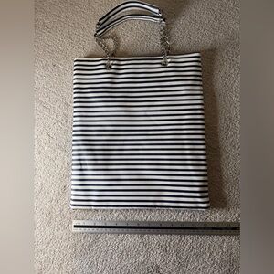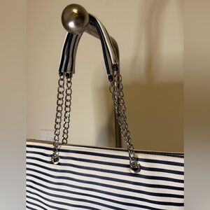 Elevate your look with this elegant striped tote featuring stylish chain handles. Ideal for any occasion.