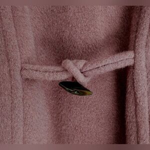 Concealed buttons, alpaca wool blend, lined, pockets, toggles, hooded. Color is dark dusty pink. Flat: shoulder to shoulder 17", pit to pit 23", length 37", length of sleeves from shoulder seam 25".