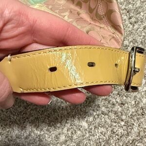 This stylish shoulder bag features a vibrant patchwork design in yellow, pink, tan, and green. Perfect for adding a pop of color to any outfit. Please note the signs of use such as very mild scuffs on the corners, mild to moderate creasing in various places throughout the strap, color transfer on the strap, a few ink marks inside, no major damages though.