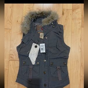 Stylish gray vest with fur trim. Features button details and pockets. Perfect for layering.