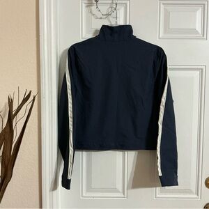 Chic navy bomber jacket by Wild Fable. Features white stripe accents on sleeves. Ideal for casual outings.