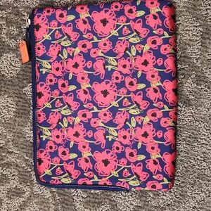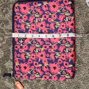 Vibrant floral tablet sleeve by Coach. Features pink and green floral patterns on a blue background. Stylish and functional.