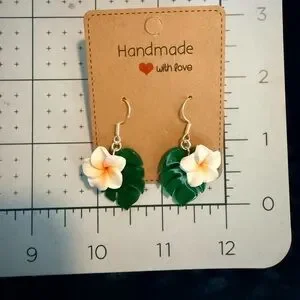 Charming earrings featuring tropical blooms and lush green leaves. A perfect accessory to bring a touch of nature to your style.