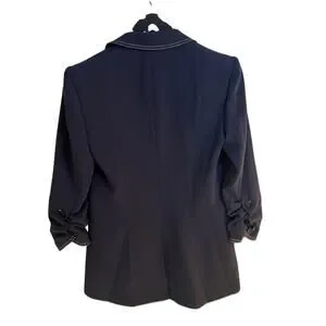 Look polished and professional in the bestselling Khloe blazer by Cinq ร Sept. Crafted from supple crepe, this expertly tailored jacket features a relaxed silhouette with structured elements that exude modern elegance. Notched lapels frame the open front, while artfully ruched three-quarter sleeves lend a touch of effortless style. Designed with faux front pockets and a back vent for added comfort and movement, this versatile blazer is ideal for workdays, evenings out, or layered looks.