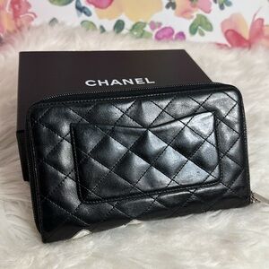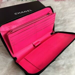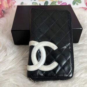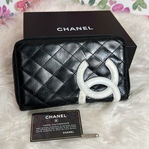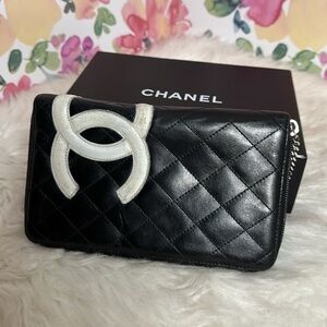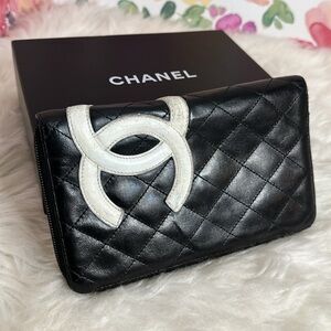💯Authentic Calfskin Cambon Zip Around Organizer Wallet Black White 🍀