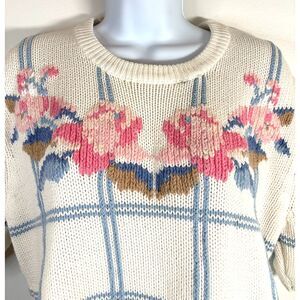 Vintage 90’s Eddie Bauer Sweater Women L Cream Floral Roses Chunky Knit Crewneck