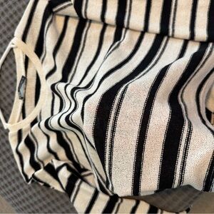 Striped knit sweater in black and white, rustic texture.