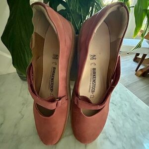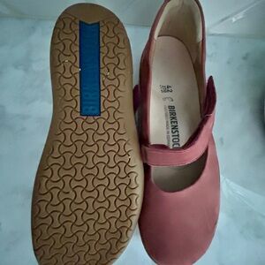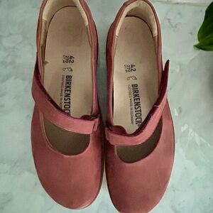 flats by Birkenstock. Maryjane style in a light wine/ burgundy type color Ideal for casual wear. Enjoy comfort and style. Sz 42 no box in really good condition