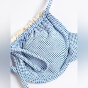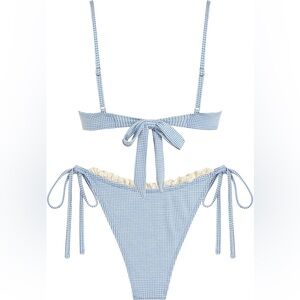 Serving cottagecore cutie meets beach babe ✨ This adorable blue gingham bikini set features the sweetest lace trim and adjustable ties for a flattering, comfy fit. Perfect for soaking up the sun or snapping those main character summer pics 💦🌞