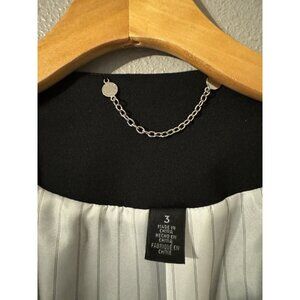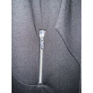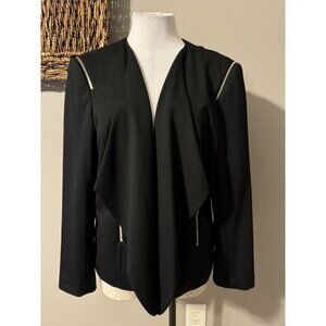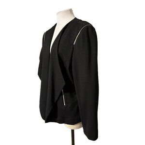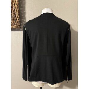 This suit jacket/blazer is from Chico's in their size 3. Solid jet black in color. Fully lined. Soft and stretchy, made of rayon, nylon and spandex. Machine washable. Meant to be worn open, it has no fasteners. Zippered pockets. Zippers across the shoulders and end of sleeves.