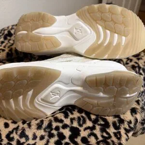 Uppers are made with the Tan LV Monogram surrounded by White Leather and Technical Materials