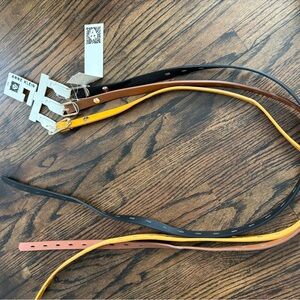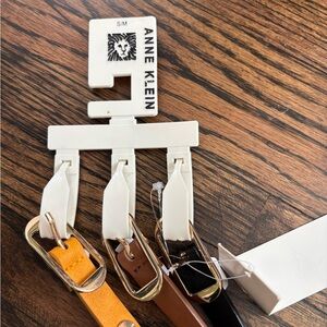 Elegant set of three Anne Klein leather belts. Features gold, brown, and black colors. Perfect for any outfit.
