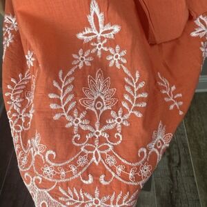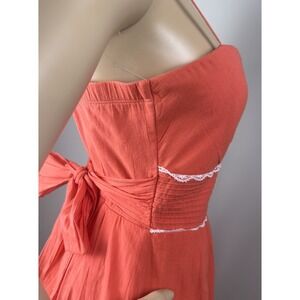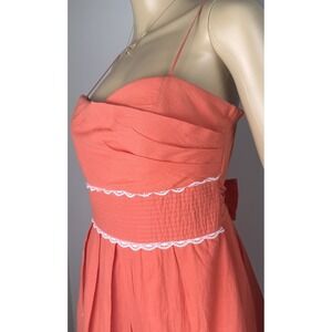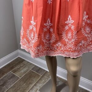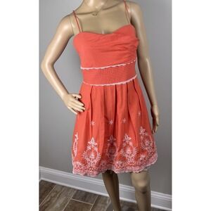 Cute coral-orange summer dress with spaghetti straps, tie waist, inner tulle layer, and white embroidered detail. Chest has built in padding.