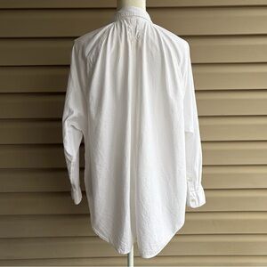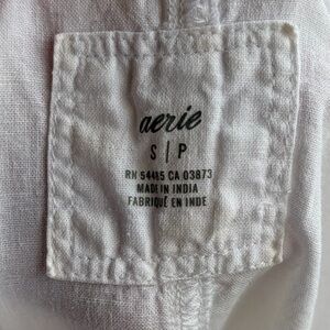 This size Small Aerie Pool-To-Party Linen Blend Cover-Up Shirt in white is crafted from a lightweight blend of 52% linen and 48% viscose, offering a breathable and soft feel ideal for warm weather. Its oversized, relaxed fit and button-down design makes it versatile for layering over swimwear or pairing with casual outfits. The shirt features a chest pocket, long raglan sleeves, and longer length, enhancing its laid-back, beach-ready aesthetic. The comfortable, breezy silhouette makes it perfect for poolside lounging or casual outings!