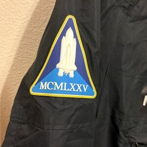 Celebrate space in the Members Only x NASA black anorak jacket! This insulated anorak features the iconic Members Only nameplate at the anorak pocket flap, while the flag patch at the left shoulder complements the shuttle patch at the right to complete the spacey look. With unique, dual asymmetrical half-zip closures, this striking jacket is sure to be a highlight of any closet.
