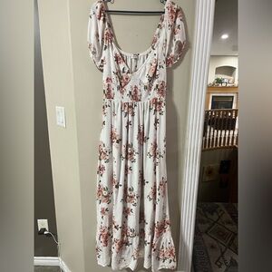Gorgeous white dress with pink floral patterns all over, sleeves are both on and off shoulder!