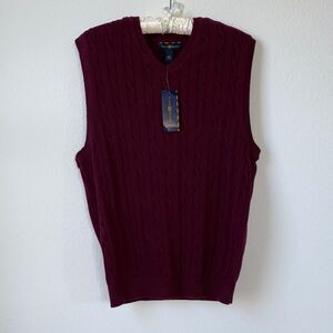 Stylish and versatile V-neck sweater vest. Features a cable knit design. Ideal for layering.