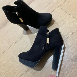 Chic black suede booties with 1” platform and chunky heels from Aldo. Ankle length. Sleek design with a gold side zipper on the outer sides. Round toe. Perfect for elevating any outfit!