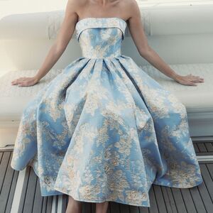 MAC DUGGAL Blue Strapless Brocade Midi Dress with Pockets