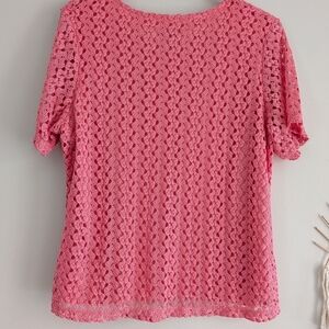 Elegant pink lace blouse. Short sleeves and round neckline. Perfect for any occasion.