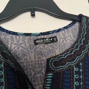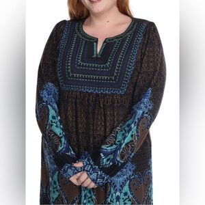 White Mark Plus Size Blue Brown Embroidered Knit Long Sleeve Mini Dress