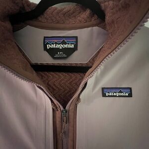 Stylish Patagonia hoodie. Two-tone brown design. Comfortable and warm. Perfect for casual wear.