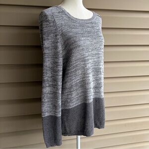 This is a chic and cozy knit sweater from Ann Taylor LOFT, ladies size Large. The soft knit, 64% polyester/19% cotton/14% rayon/3% other fiber, is a versatile heathered gray color. Features a classic crew neckline and a relaxed, easy fit that’s perfect for everyday wear. Subtle iridescent sequins woven throughout the knit add a soft shimmer that catches the light without being over the top. Long sleeves and a slightly longer length make it great for layering with jeans, leggings, or trousers!
