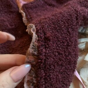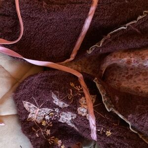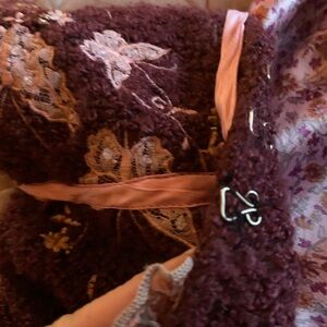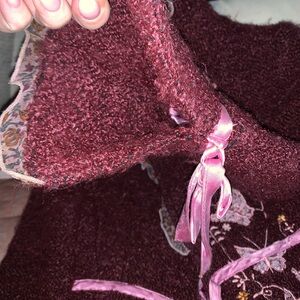 This very Vintage Unique maroon jacket had a cute antique look with its floral pink lining. Baby pink satin ribbon front tie & also on sleeves this adorable piece has embroidered butterflies & lace detail, front hook & eye closure. Will look so fabulous with wide leg denim. Perfect condition.