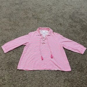 Stylish pink and white striped blouse with lace-up front. Features tassel details and three-quarter sleeves.