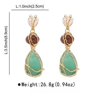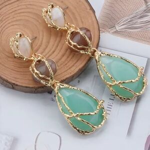 Bold earrings with gold accents and green stones. Perfect for a chic look.