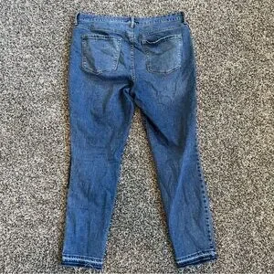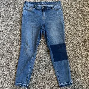 Women’s old navy patchwork jeans in a medium wash with distressed raw hems size 14