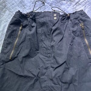 Midi black cargo skirt with pull strings on the waist and zipper detailings. Color a bit faded due to age. Size tagged 6, waist a little stretch due to the pull strings.