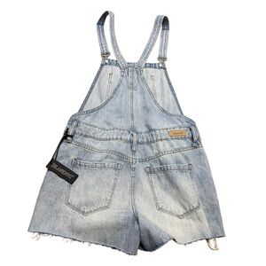 Trendy Blank NYC denim shortalls featuring a light wash with intentional distressing and a relaxed, lived-in vibe. Classic overall silhouette that’s perfect for casual styling, festivals, or layering with tees and tanks.