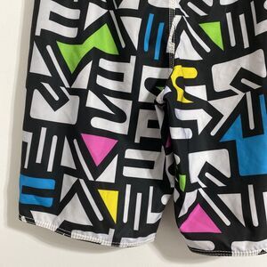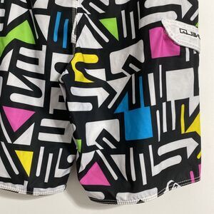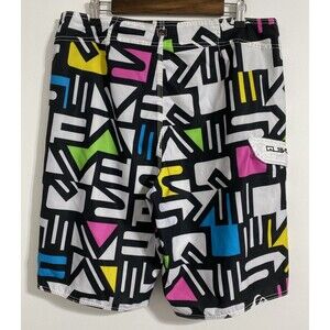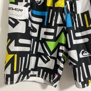 Quicksilver Board Shorts Men's Waist 36 Swim Trunks Cargo Pocket Unlined 90s Y2K Surfwear Performance Sports Coastal Beach Ocean Pool Vacation Cruise Resort Spring Break Casual Comfort Surfing Swimming Saved By The Bell Show Dopamine Rainbow Rainbowcore Pattern Colorway Vibes. Pre-owned, very gently used with no flaws and tons of life left! Please see all pictures and read the measurements. Black, white, pink, blue, green and yellow in color. Hook and loop fly closure with drawstring.