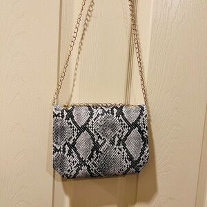 Make a bold statement with this chic snakeskin print crossbody bag, designed to elevate any outfit with a sleek, modern edge. Featuring a classic black and white faux python pattern, this structured mini bag is finished with a gold-tone chain strap and a stylish turn-lock closure for a high-end look.