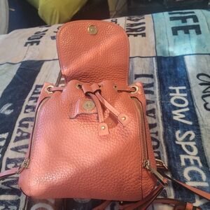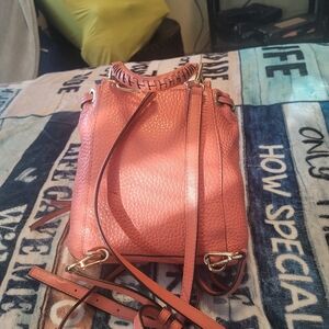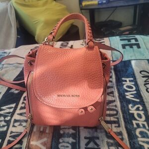 Stylish pink backpack with gold accents. Features textured leather and adjustable straps. Perfect for everyday use.