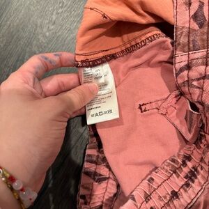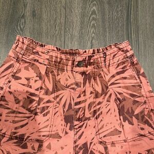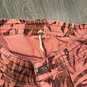 Statement utility-style shorts from Free People featuring an allover tropical leaf print in warm coral and brown tones. Designed with a structured high-rise fit, front patch pockets, and a relaxed silhouette that’s easy to style for summer.