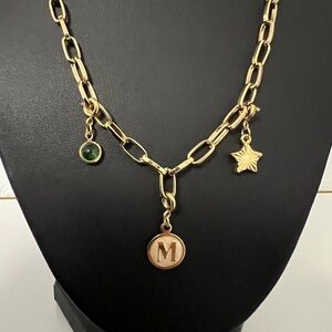 18k gold plated paper clip necklace with charms including the letter “M”.