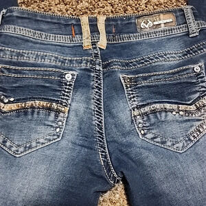 These Realtree skinny jeans feature a classic denim blue color with a stylish faded wash, offering a modern and sleek look. The jeans are designed with a skinny fit, providing a flattering silhouette that pairs well with any casual outfit. The contrast stitching adds a touch of detail, enhancing the overall aesthetic.