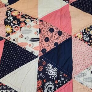 Artisan charm unfolds in this handmade patchwork quilt, a cozy masterpiece of textile artistry. A symphony of triangle patterns dances across the surface, blending floral prints, paisley motifs, and geometric designs in a harmonious arrangement. The color palette of pink, navy blue, and cream creates a soothing and inviting aesthetic. A navy blue border frames the quilt, adding a touch of sophistication and structure to the design. The reverse side features a delicate floral pattern in pink on a white background, completing the quilt's enchanting appeal.